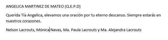 Categoria: Fúnebres Querida Tía, elevamos una oración por tu eterno descanso. Siempre estarás en nuestros corazones. Nelson Lacrouts, Monica Navas, Ma. Paula Lacrouts y Ma. Alejandra Lacrouts.