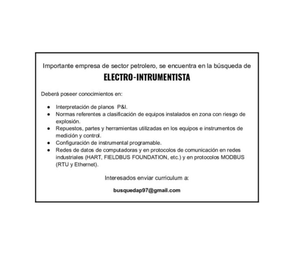 Importante empresa de sector petrolero, se encuentra en la búsqueda de electro-instrumentista. Deberá poseer conocimientos en: *Interpretación de planos P&I. *Normas referentes a clasificación de equipos instalados en zona con riesgo de explosión. *Repuestos, partes y herramientas utilizadas en los equipos e instrumentos de medición y control. *Configuración de instrumental programable. *Redes de datos de computadoras y en protocolos de comunicación en redes industriales (HART, FIELDBUS FOUNDATION, etc.) y en protocolos MODBUS (RTU y Ethernet). Interesados enviar curriculum a: busquedap97@gmail.com